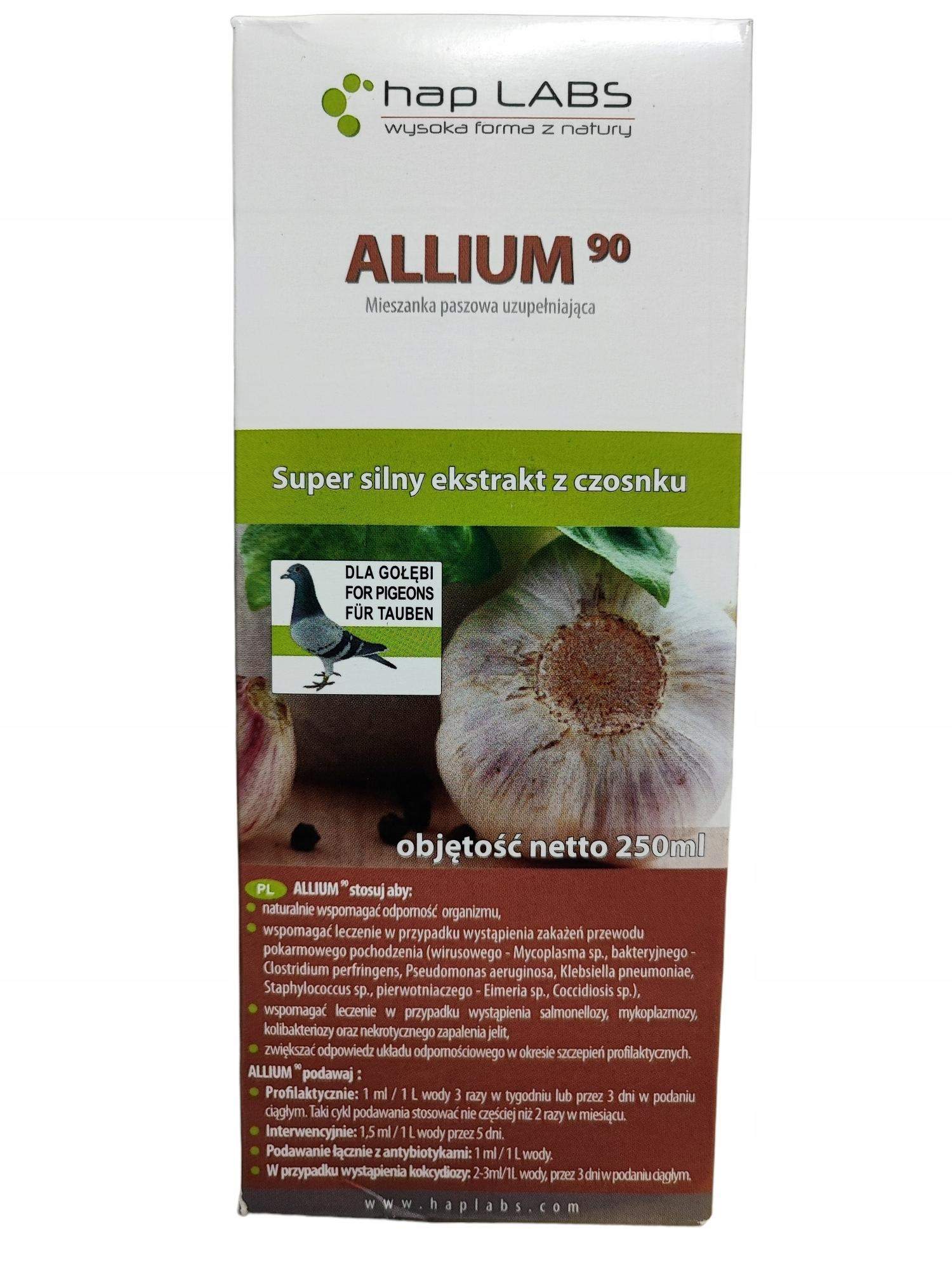 ALLIUM 90 to silnie skoncentrowany 4-krotnie ekstrahowany wyciąg z kilku gatunków czosnku z dodatkiem substancji aktywnych pochodzących z żeń-szenia i jeżówki purpurowej. Czosnek jako naturalny antybiotyk posiada silne właściwości przeciwbakteryjne, przeciwwirusowe, przeciwgrzybicze i przeciwpierwotniacze. Specjalnie zagęszczony ekstrakt wykazuje znacznie silniejsze działanie immunostymulujące, niż własnoręcznie wyciskany czosnek. Właściwości ekstraktu z czosnku są szczególnie przydatne w profilaktyce chorób zakaźnych oraz w walce z toczącymi się w stadzie infekcjami zarówno bakteryjnymi jak i wirusowymi.