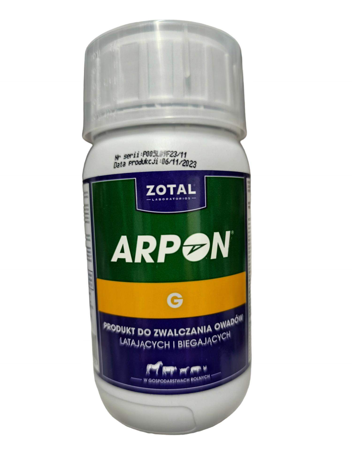 Dawkowanie: Preparat ARPON G stosować w rozcieńczeniu 1:100 (100 ml preparatu w 10 litrach wody). Tak przygotowany 1% roztwór roboczy - nanieść na powierzchnie nieporowate w ilości 50 ml/m2, na powierzchnie porowate w ilości 100 ml/m2. Używać odzież ochronną (maska na twarz, gumowe rękawice i nieprzepuszczalne buty). Odpowiednio oczyścić sprzęt służący do nanoszenia preparatu za pomocą czystej wody. Nie mieszać z innymi produktami. Nie używać pojemników ponownie. Efekt widoczny po 2–5 minutach. Zalecany czas pomiędzy zastosowaniami wynosi dwa tygodnie.