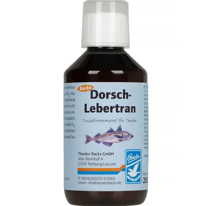 Backs Dorsch-Lebertran – tran wątrobowy z dorsza zawiera naturalne witaminy A i D3 w wysokiej koncentracji. Witamina A wzmacnia odporność błon śluzowych na bakterie patogenne. Poza tym jest niezbędna dla prawidłowego wzrostu młodych. Witamina A wpływa pozytywnie na rozwój embrionlany w jaju oraz wyklucie. Zawartość substancji składowych: 100% oleje i tłuszcze surowe