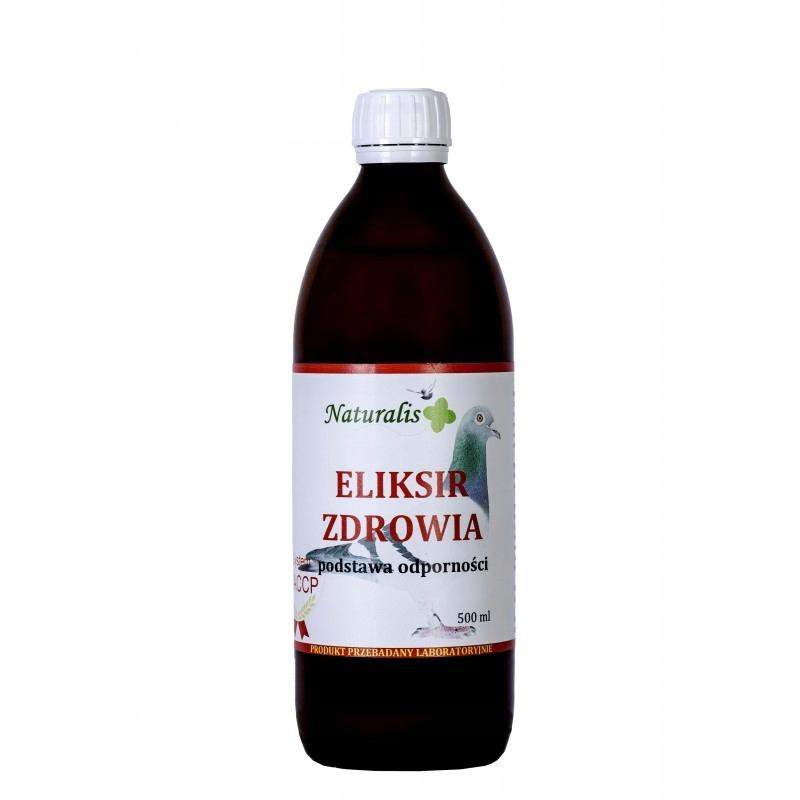 ELIKSIR ZDROWIA to w 100% naturalne, najwyższej jakości uzupełnienie diety gołębi pocztowych. ELIKSIR ZDROWIA działa fenomenalnie na układ oddechowy i trawienny, wspomaga system odpornościowy oraz zwiększa siłę, witalność oraz wytrzymałość. Przyspiesza regenerację organizmu po odbytych lotach i chorobach. Zawiera wiele substancji działających kompleksowo, między innymi: ekstrakty z czosnku, cebuli, marchwi, pietruszki, rzepy czarnej, selera korzeniowego, buraka i wielu innych warzyw oraz ziół. W skład ELIKSIRU ZDROWIA wchodzi również ocet jabłkowy z miodem i propolis w specjalnie dobranych proporcjach. Pełny skład preparatu jest zastrzeżony.
