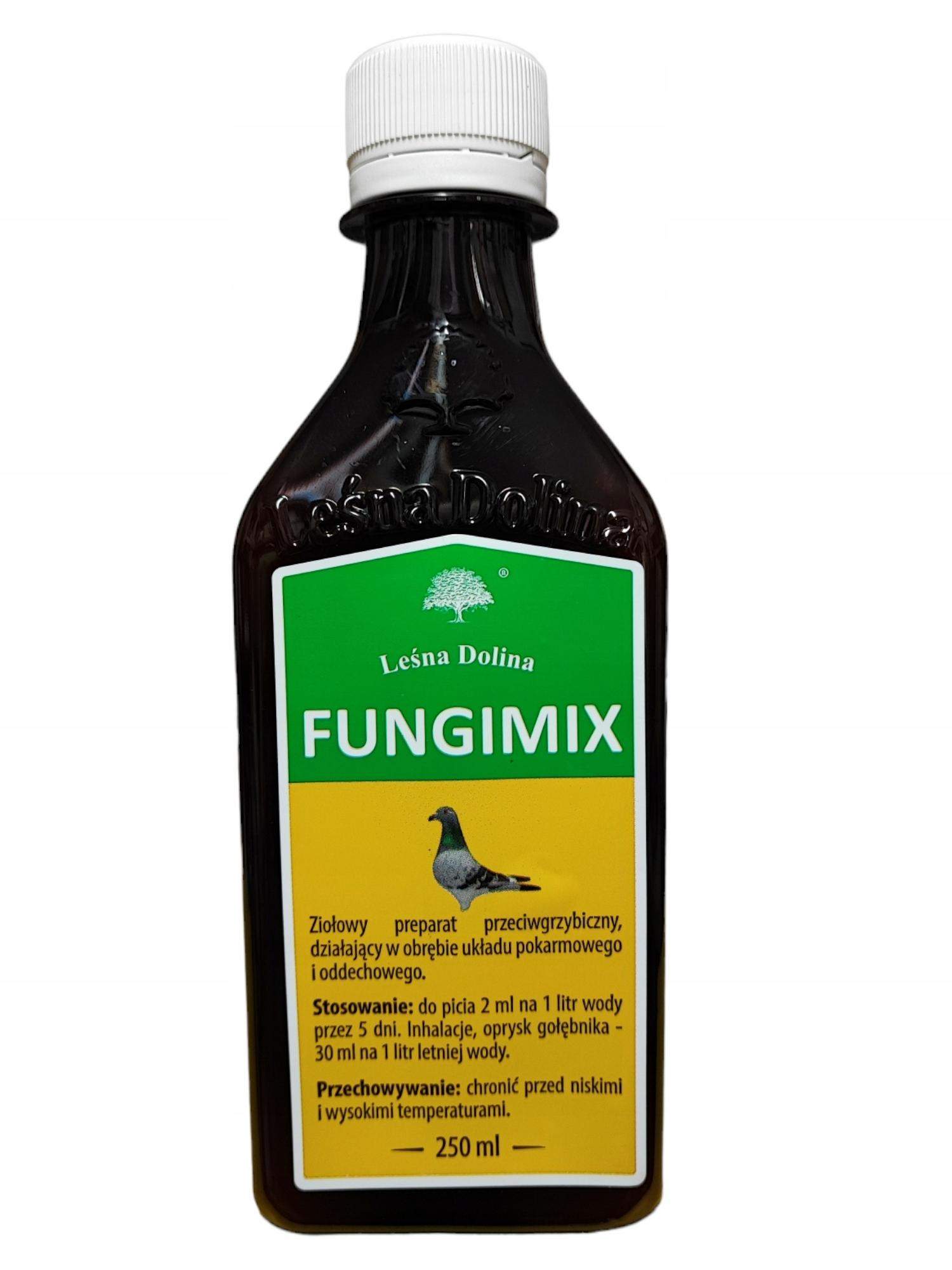 FUNGIMIX marki Leśna Dolina to naturalny preparat przeciwgrzybiczy opracowany z myślą o zdrowiu układu pokarmowego i oddechowego gołębi. Dzięki kompozycji starannie dobranych wyciągów ziołowych wspiera organizm ptaka w walce z infekcjami grzybiczymi, takimi jak candida czy aspergillus, nie obciążając jednocześnie organizmu substancjami chemicznymi. Może być stosowany zarówno wewnętrznie – w wodzie pitnej, jak i zewnętrznie – jako środek do inhalacji lub oprysków gołębnika.