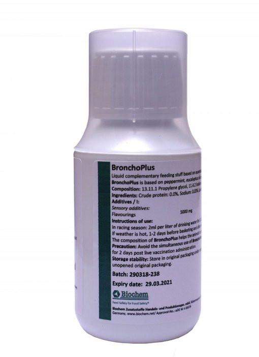 Zapobiega chorobom układu oddechowego w sezonie lotowym Zmniejsza ilość nadmiernej ilości śluzu w drogach oddechowych Stymuluje naturalną obronę organizmu Zapewnia wsparcie w przypadku stresu cieplnego Naturalny - bez skutków ubocznych Wysokiej jakości składniki i certyfikat GMP + BronchoPlus to doskonale zbilansowana formuła na bazie naturalnych olejków eterycznych z mięty pieprzowej, oleju eukaliptusowego i mentolu. Skład preparatu BronchoPlus pomaga gołębiom zmniejszyć ilość nadmiernej ilości śluzu w drogach oddechowych.