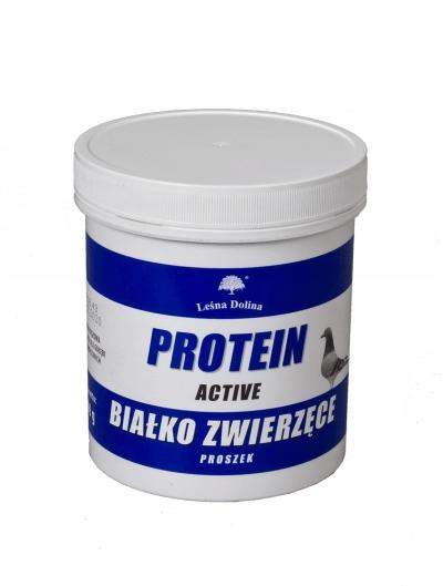 Preparat zawierający 95% wysokiej jakości łatwo przyswajalnego białka zwierzęcego, w tym aminokwasy rozgałęzione „BCAA” i kolagen. Białko zwierzęce PROTEIN ACTIVE uzupełnia niedobory aminokwasów egzogennych występujące w karmie roślinnej. Przyczynia się w ten sposób do wszechstronnej regeneracji komórek i tkanek. Wspomaga działanie układu odpornościowego, mięśniowego oraz stawów, ścięgien i kości. Podawany systematycznie przyczynia się do prawidłowego rozwoju młodych gołębi.