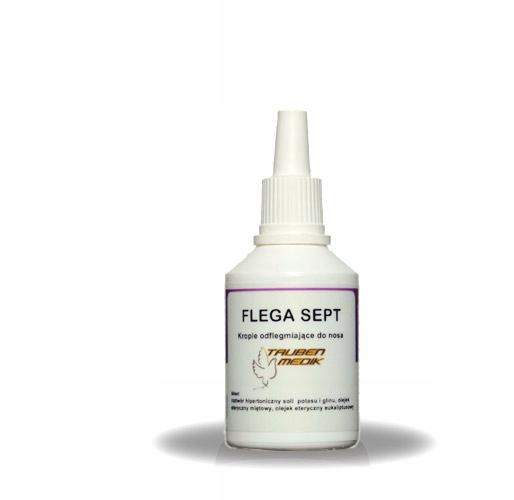 Flega Sept dla gołębi - krople do zakrapiania nosa o działaniu odflegmiającym. Oczyszczania zatok w celu poprawy wydolności lotowej. Krople działają po kilku minutach od zaaplikowania. Wkrapia się do nosa i po ok. 5 - 10 min. osad w zatokach rozpuszcza się, ściskamy nos i wacikiem usuwamy galaretowaty wyciek z rozpuszczonej flegmy, która zalegała. Nie zawiera antybiotyku. 20 ml preparatu wystarcza na około 100 zabiegów.