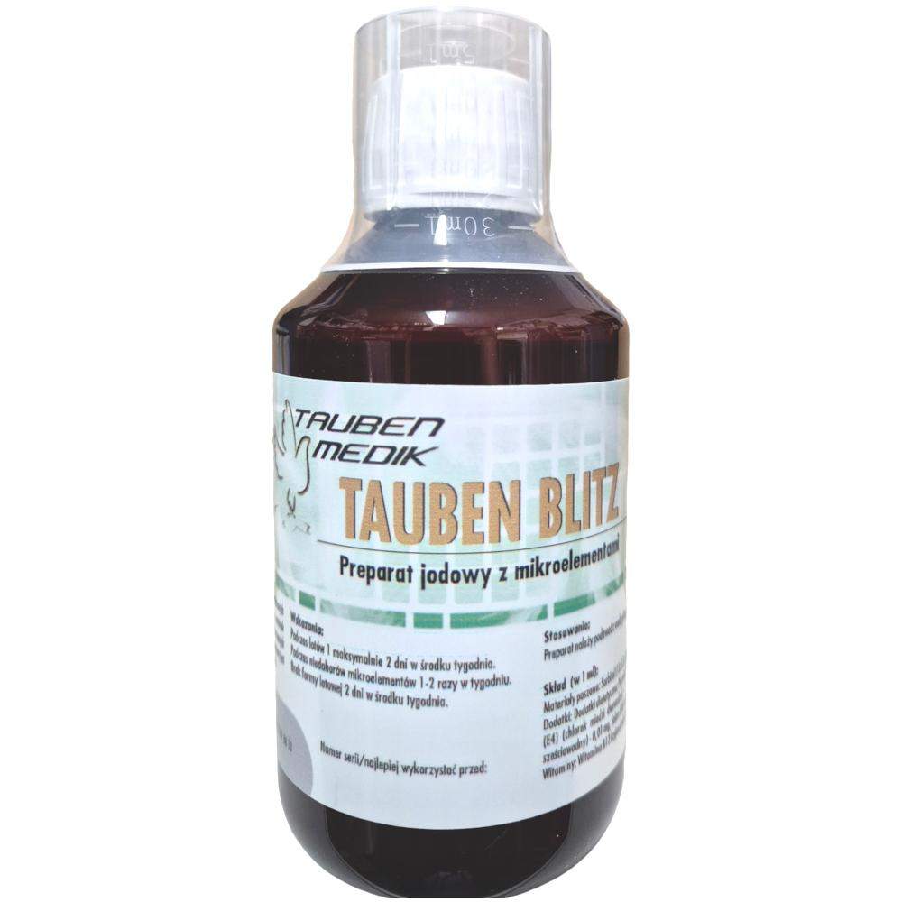TAUBEN BLITZ 250 ml to specjalistyczny preparat z jodem, żelazem, witaminą B12 i mikroelementami, który wspiera formę lotową, poprawia dotlenienie organizmu i przyspiesza regenerację. Idealny dla gołębi pocztowych i wystawowych – szczególnie w okresie lotów, spadku kondycji lub niedoborów.